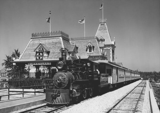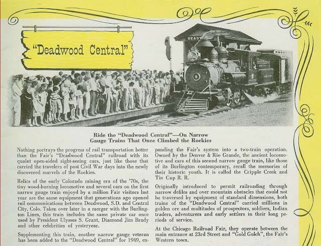 When the duo arrived in Chicago, Disney had already been considering the creation of what he called “Mickey Mouse Park” with rides for children. What he found at the Rail Fair caused him to completely re-envision the concept of an amusement park. The Fair’s grounds were set up similar to the 1893 World Columbian Exposition with its various “villages.” The Rail Fair’s version consisted of locations including a beach, a French quarter, a dude ranch, and a pueblo village. According to Train by Tom Zoellner, “The connecting thread between all these villages was…an old timey railroad: the Deadwood Central, a tribute to the western mining roads of the 1870s, which ran on narrow gauge and cost a dime to ride.”