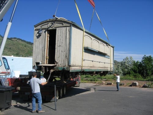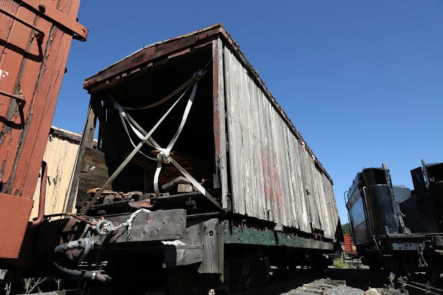 C&S 8308 remains at CRM as a flatcar with the body of C&S boxcar 8310 sitting on top of it.